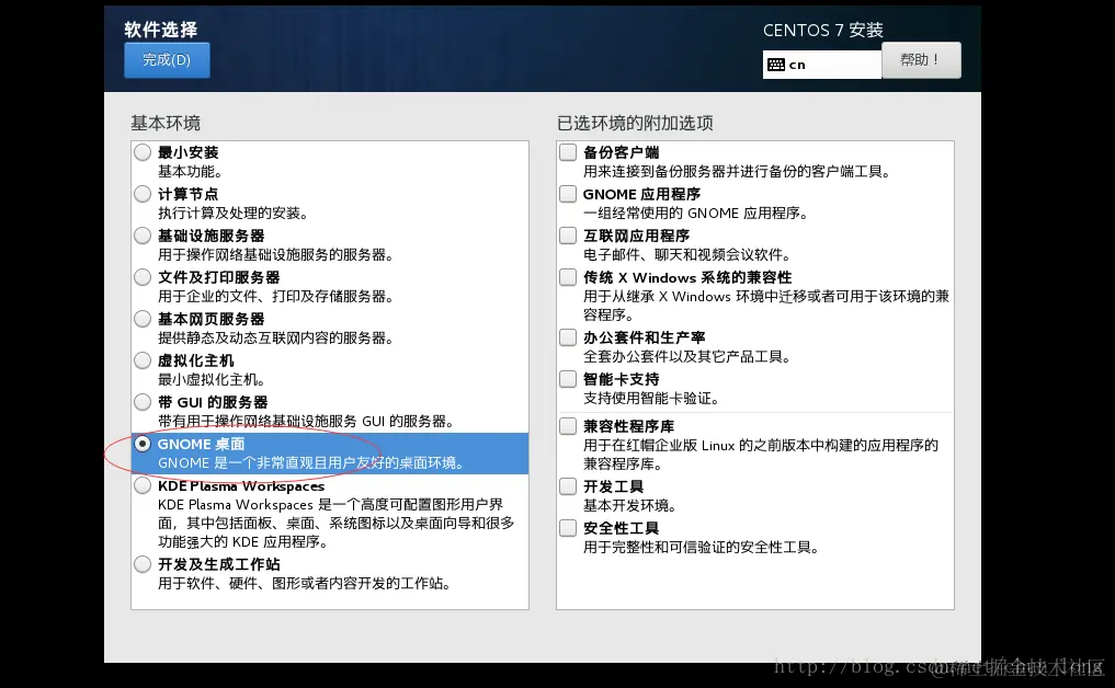 2、为了安装 GUI 友好的界面,此时当你点击 “软件选择” 按钮之后进入如下图页面,之后选择 GNOME 桌面选项,就会安装命令行模式的系统和 Linux 桌面的系统。