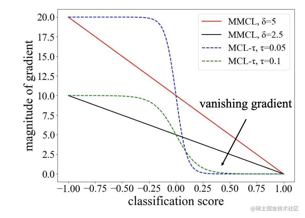 显然,升级后的MCL损失仍然在分类分数大于0.25或者小于-0.25时有梯度消失的问题。另一个问题是,由于任务涉及到很多类别,使得正负类别不均衡。为了解决这个问题,作者进一步提出了MMCL损失。