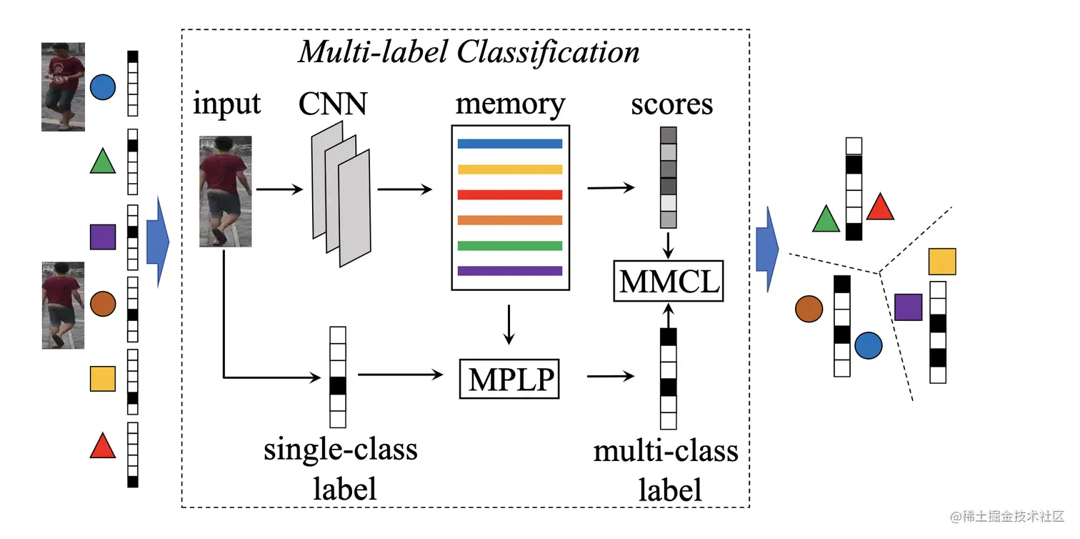 不同于普遍的基于交叉熵损失进行训练的单标签分类模型,本文使用多标签分类模型完成训练。所谓的多标签分类模型,即在初始过程中,对于单张图片赋予单独的类,通过后续的迭代,使一张图片不仅属于自身的类,同时也属于其它和该照片同属于一个人的照片的类。为了加速多分类模型的训练效率,本文提出了memory-based multi-label classification losss(MMCL)。该损失函数的主要思想在于,具有共同标签的两张图片其特征之间的cosine距离应该更接近1,具有不同标签的则应接近-1。