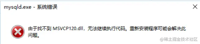 手动安装mysql5.7.29版本,在mysql的bin目录中通过cmd执行mysqld -install命令时提示由于找不到MSVCR120.dll,无法继续执行代码.重新安装程序可能会解决此问题。