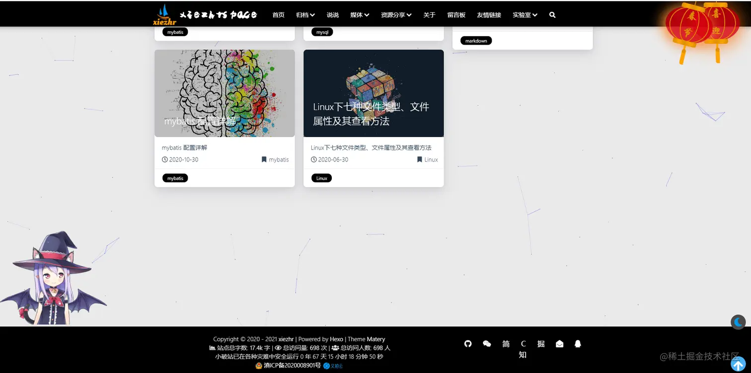 也逛了不少个人博客,然后发现一个挺漂亮的博客:itsNekoDeng,博客是用hexo搭建的主题是Matery。hexo也是用的比较多得,而且主题也比较多。