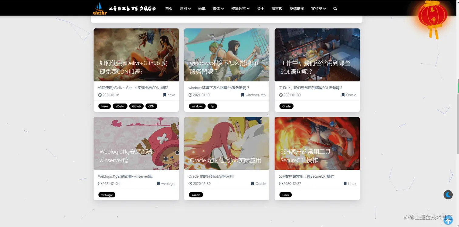 博客美化 博客建立不久后加了【个人博客建站交流群】,群里陆续有大佬加入。有工作了的、上大学的、高中的、初中的,聊技术聊家常,大家都能聊到一块。为了搞好一东西,大佬可以通宵达旦,真的挺佩服。从大佬那也白嫖了不少漂亮页面,不少好东西。默默做个白嫖党挺好~