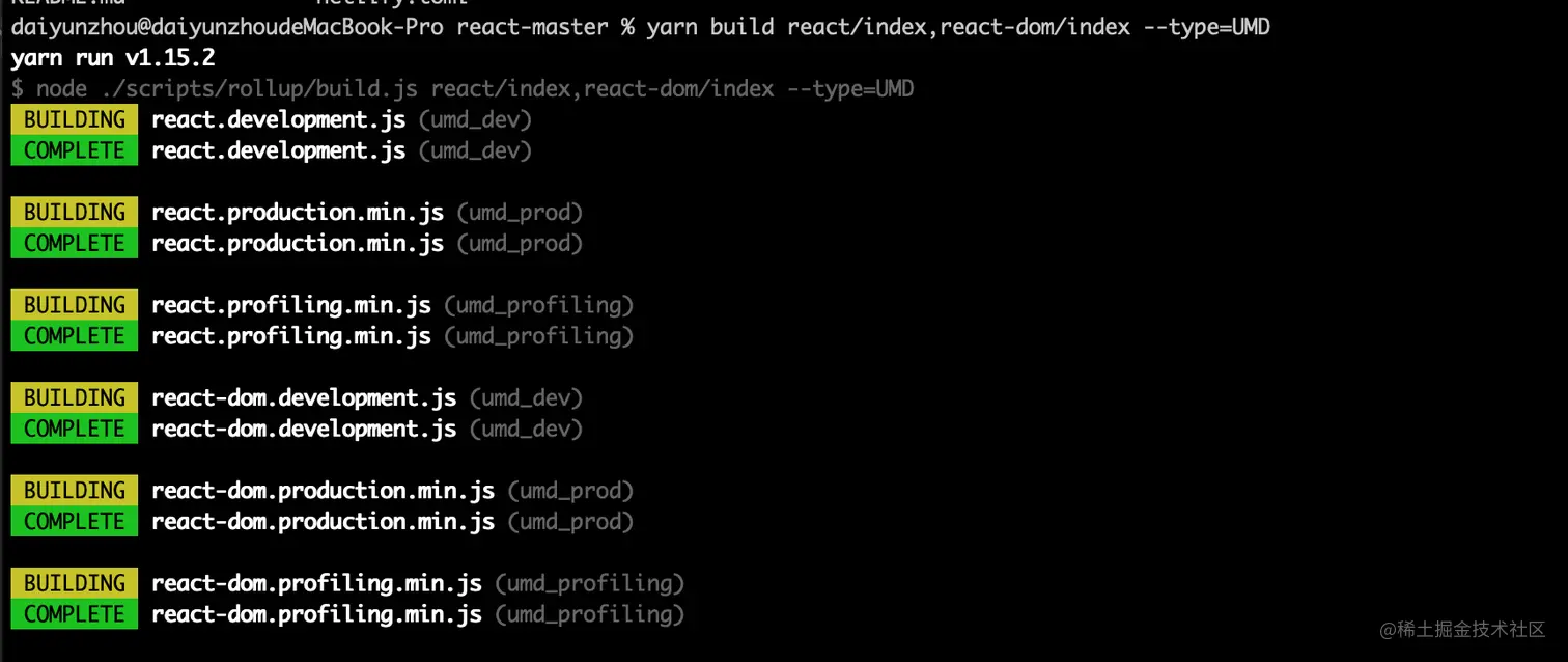 在根目录下执行yarn build react/index,react-dom/index --type=UMD,生成打包后的文件。
