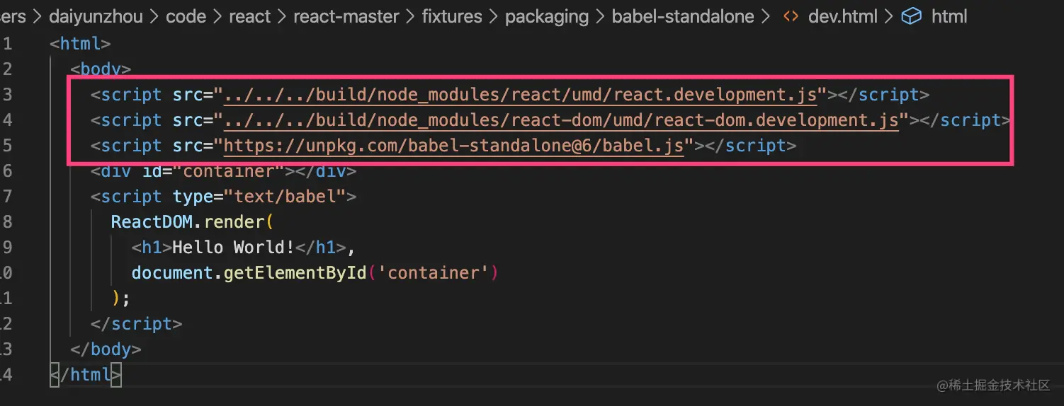 找到根目录/fixtures/packaging/babel-standalone/dev.html文件,可以看到是加载了这三个文件。