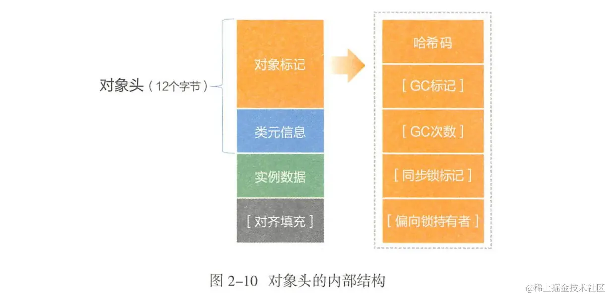 空间至少是16B对象分配 对象头,对象头占12个字节,存储内容对象标记(MarkOop)和类元信息(KlassOop)。 对象标记存储对象本身运行时的数据,在64位JVM上占8个字节,称"Mark Word";类元信息存储的是对象指向它的类元数据(Klass)的首地址,占4个字节- 实例数据(Inatance Data),存储本类对象的实例成员变量和所有可见的父类成员变量