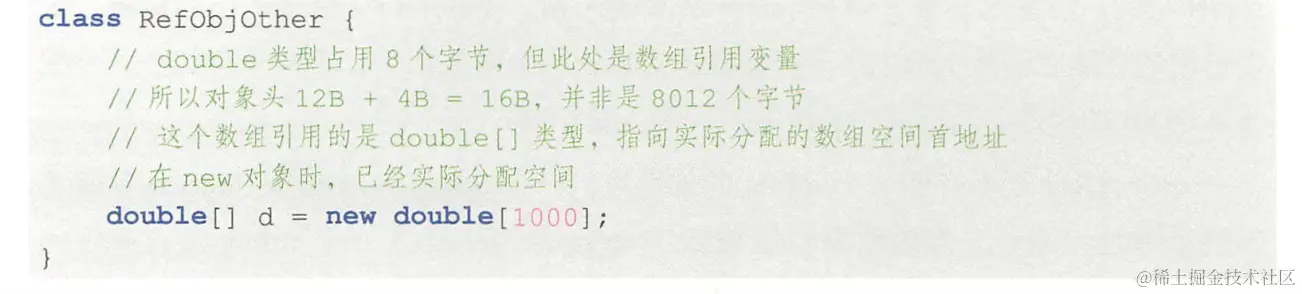 存储refobj的首地址,可以直接使用双等号==进行等值判断,不管它指向包装类、集合类、字符串类还是自定义类,refvar均占4B空间。 - refobject 无论是多么小的对象,最少占用的存储空间是12B(用于存储基本信息,称为对象头),但由于存储空间分配必须是8B的倍数,所以初始分配的