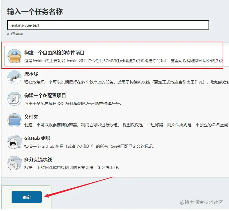 打开 jenkins 管理页面的新建任务,选择自由风格。