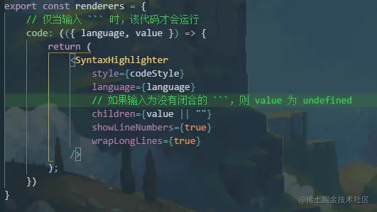 react-syntax-highlighter 解析 markdown 的块级代码的时候,如果只看到一个 ```,没有解析到闭合的时候,就会返回 undefined,造成页面 bug。解决方案是当解析到 undefined 时候,返回 ""。