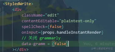 在 contentEditable 的元素里,grammarly 会起作用,写 markdown 大概是不需要这个的,加上 data-gramm={false} 关闭(注意这里是用-隔开,非驼峰写法)。