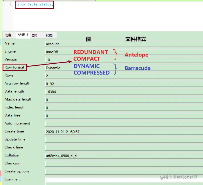 - COMPACT 行格式: 与REDUNDANT行格式相比,COMPACT行格式减少了约20%的行存储空间,但代价是增加了某些操作的CPU使用量。如果系统负载是受缓存命中率和磁盘速度限制,那么COMPACT格式可能更快。如果系统负载受到CPU速度的限制,那么COMPACT格式可能会慢一些。