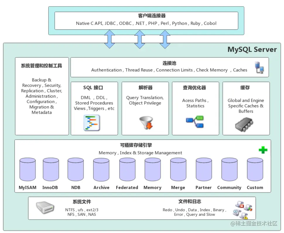 MySQL Server 自顶向下:网络连接层 -> 服务层 -> 存储引擎层 -> 系统文件层