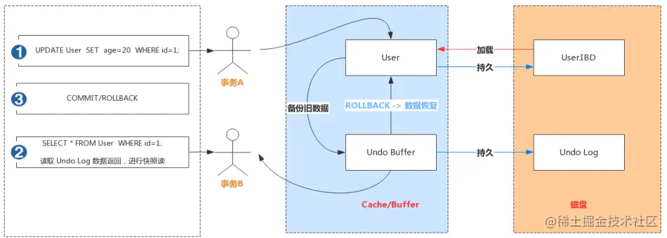 事务A手动开启事务,执行更新操作,首先会把更新命中的数据备份到 Undo Buffer 中。