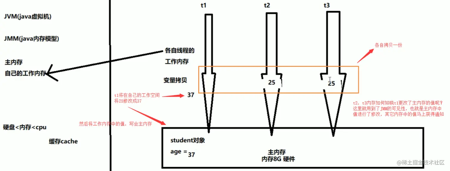 - 当同时有三个线程同时访问 student中的age变量时,那么每个线程都会拷贝一份,到各自的工作内存,从而实现了变量的拷贝