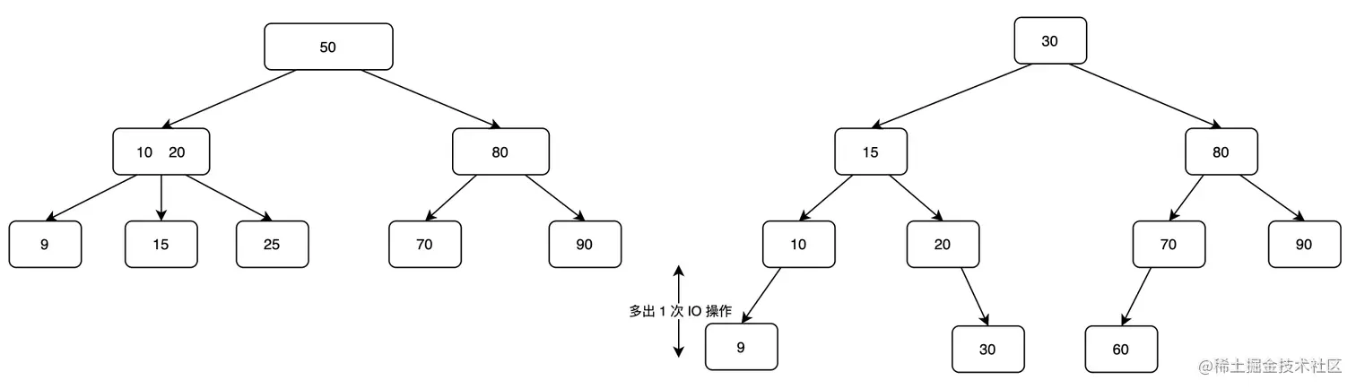通常在缓存查找树结构的时候,会以层为单位缓存,多路查找树单层的数据会存储更多数据,从而减少 IO 次数。比如上图,假如 2-3 树缓存了第二层节点 [10, 20 , 80],如果要查找数据 9,需要一次 IO:由 [10,20] 读到第三层 [9]。二叉树缓存根节点 [15, 80],则需要两次 IO: 先读取到第三层 [10, 20, 70, 90 ],再读到第四层 [9]。