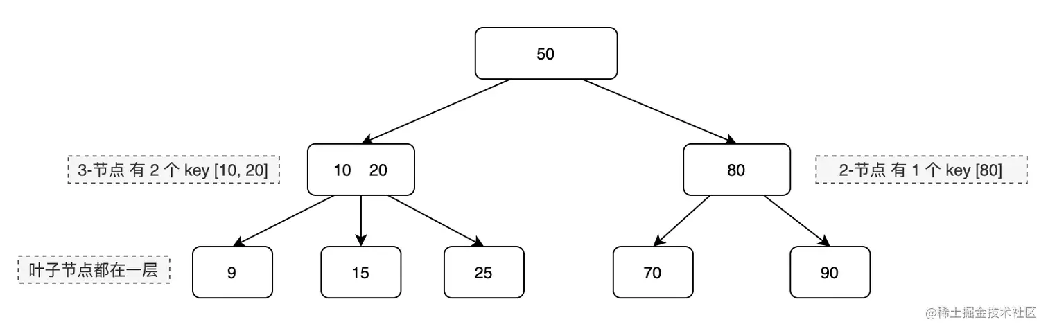 每个节点里可以包含 1 或 2 个 key,子节点数量是父节点 key 的数量 +1,左子节点 key 小于父节点左 key,右子节点 key大于父节点右 key,中间子节点 key 大于左 key 小于右 key。