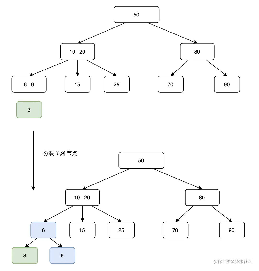 兄弟节点分裂后,左 key 节点为新父节点,父节点下移为新左节点,右 key 节点仍为新右节点