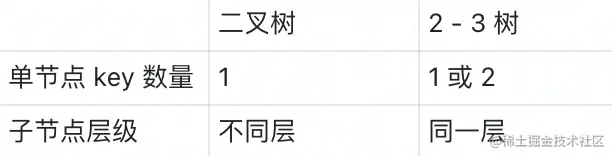- 二叉树每个节点只有一个 key,而 2-3 树可以有 2个