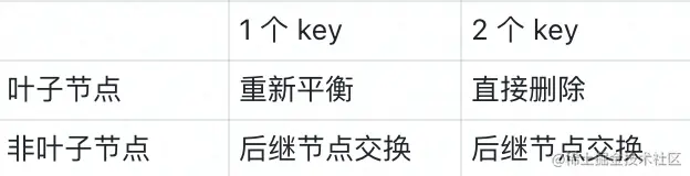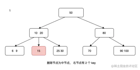 后继节点交换后,如果叶子节点包含 2 个 key,则可以直接删除此 key。但是如果叶子节点只包含 1 个 key,删除 key 后,需要重新平衡。