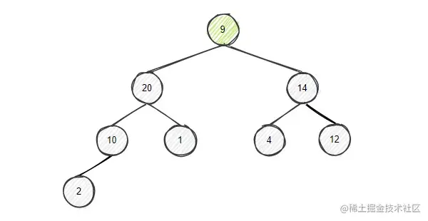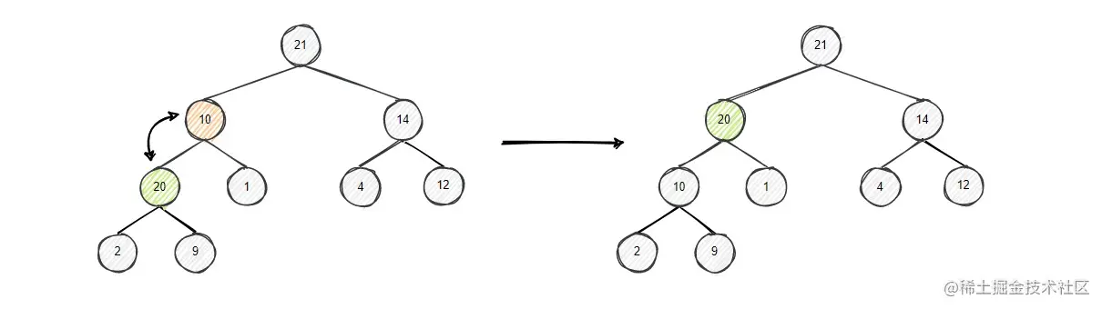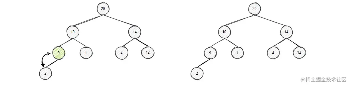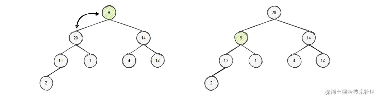 节点9的左右孩子中左孩子更大,将9和左孩子20比较,左孩子大,进行交换,