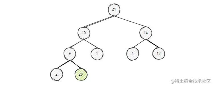 首先将20与其父节点9进行比较,发现20比9大,所以将20和9进行交换,