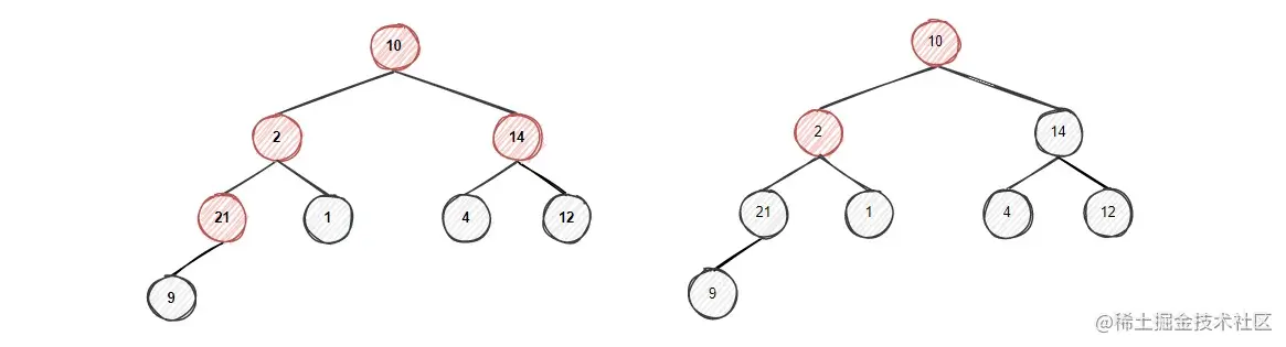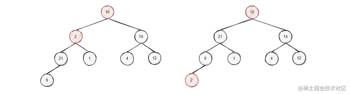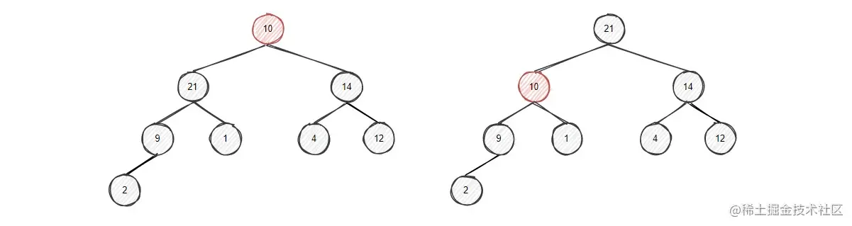节点9的左右孩子中左孩子10更大,将9和左孩子10比较,左孩子大,进行交换,
