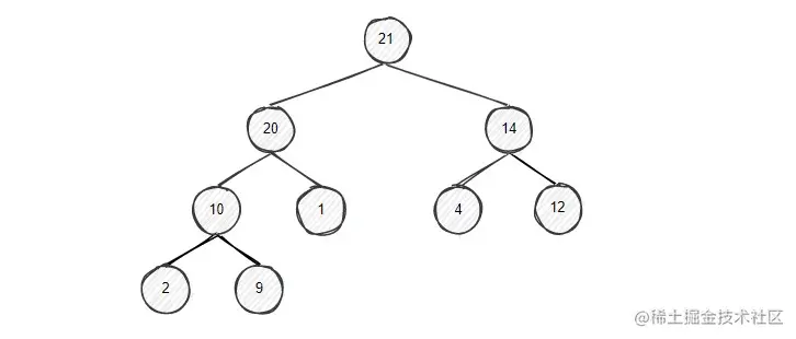 在和父节点21比较,此时20比21小,已经满足了堆的大顶堆的特性,所以节点20的上浮操作就完成了,得到了一个大顶堆。