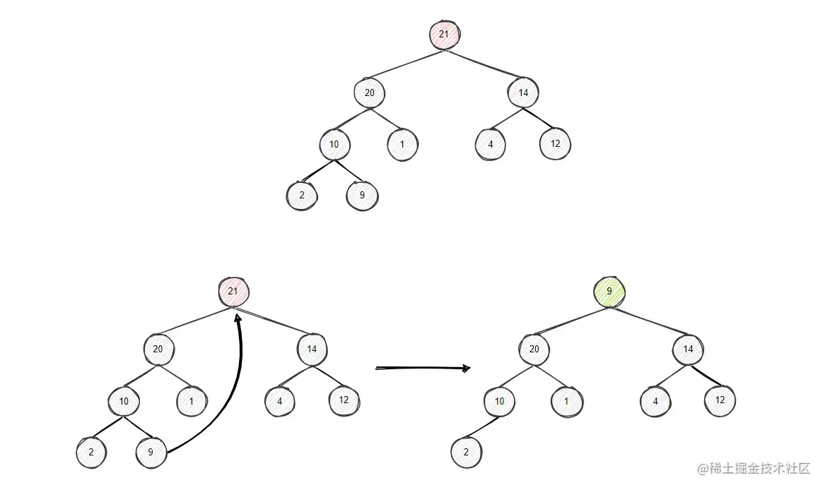 下图中的最大堆,要删除堆顶元素21,用最后一个节点9替换堆顶元素,并删除节点9,然后对堆顶节点进行下沉操作。