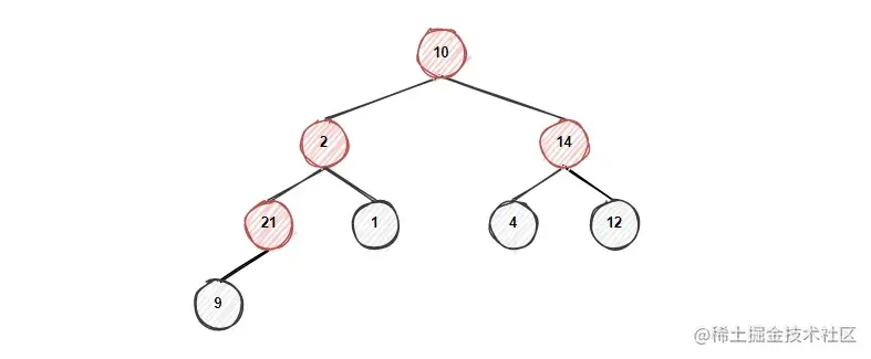 首先节点21和节点14已经满足了大顶堆的性质,不需要进行任何操作,