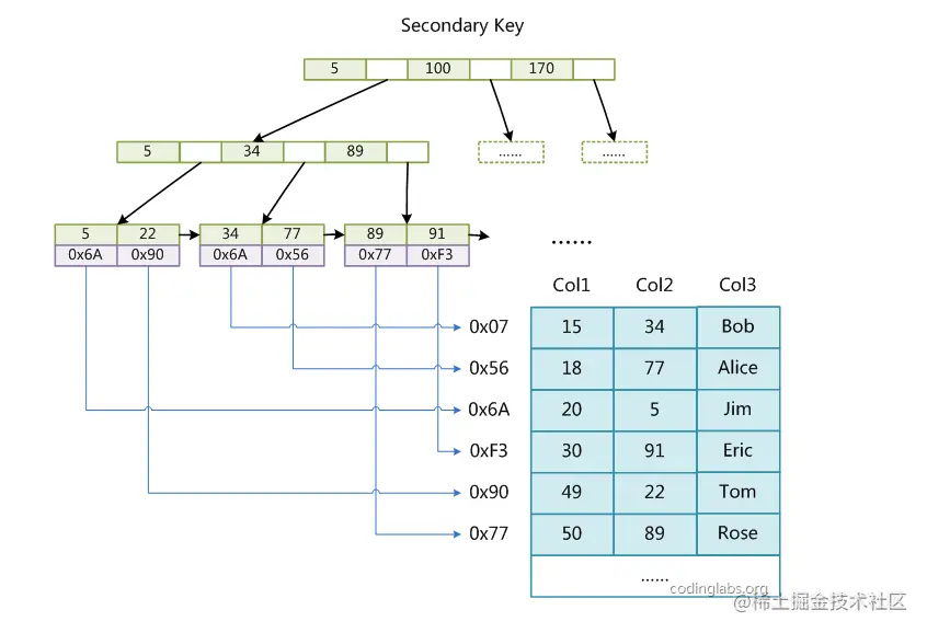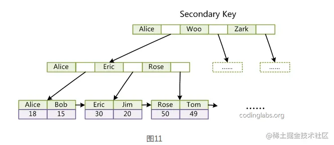 - 例如:select id, name from users where name = 'jack'; (对name建立辅助索引)。这个示例中由于对name字段建立辅助索引,而辅助索引每个叶子节点的data域保存主键值,则不需要进行回表操作,即可拿到id和name。