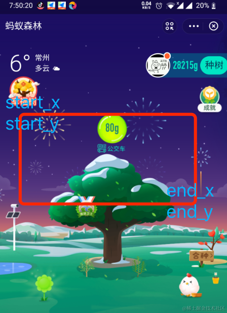 在蚂蚁森林中并不能通过用 id 的方式定位到能量球,只能用在能量球可能出现的区域用坐标点击,start_x,end_x,start_y,end_y 是这个区域左上角和右下角的坐标位置。
