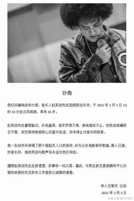 2月3日,赵英俊家人发表讣告,称赵英俊因病医治无效,于2021年2月3日14时33分在北京病逝,享年43岁。\