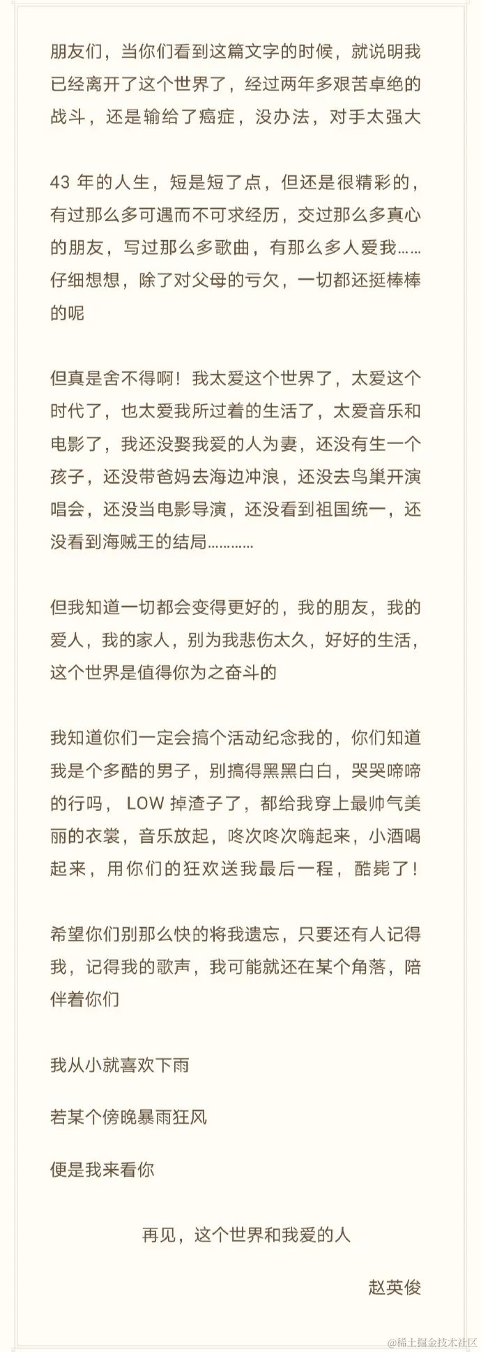 在他去世的当天,他的微博“赵英俊是潇洒哥”发布一条微博:这是他留给这个世界的最后一篇小作文。作文的内容是一张便签图片。\