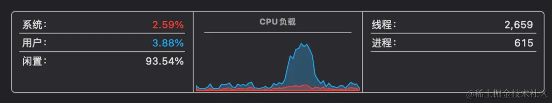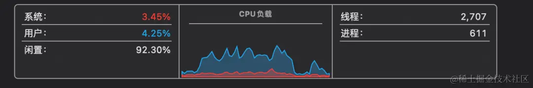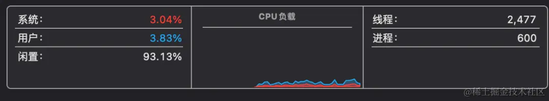 现在来看 Apple Silicon 版本怎么样,运行之前还是先来一张当前的 CPU 占用率截图,可以看出闲置率大概93%的样子。
