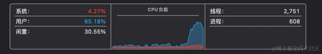 好了,下面这张就是 IDEA 初始化结束后的 CPU 占用率波动以及初始化运行时长的截图,看好这个图下面我们再看 Apple Silicon 的表现。