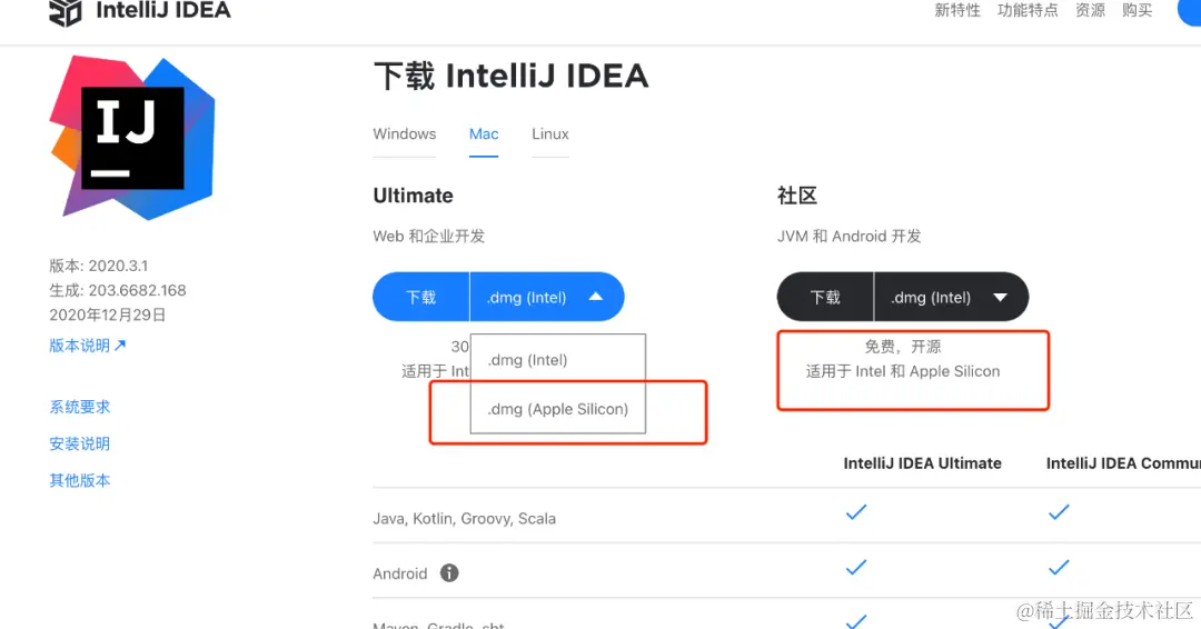 首先我们要到 jetbrains 的官网 (www.jetbrains.com/zh-cn/idea/… intel 版本的,点击这个下拉框可以看到 Apple Silicon 版本下载。