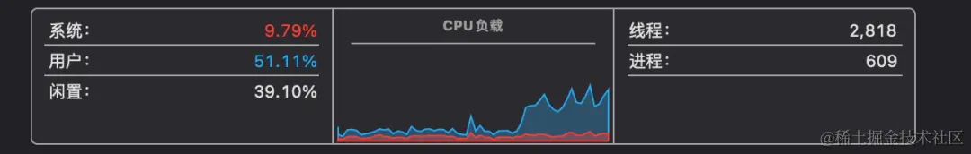 可以看到目前 CPU 闲置还剩39%, 其实最少时闲置有30%,也就最高时 CPU 使用率能达到70%左右,但只有很短的时间,截图手速慢了没截到。\
