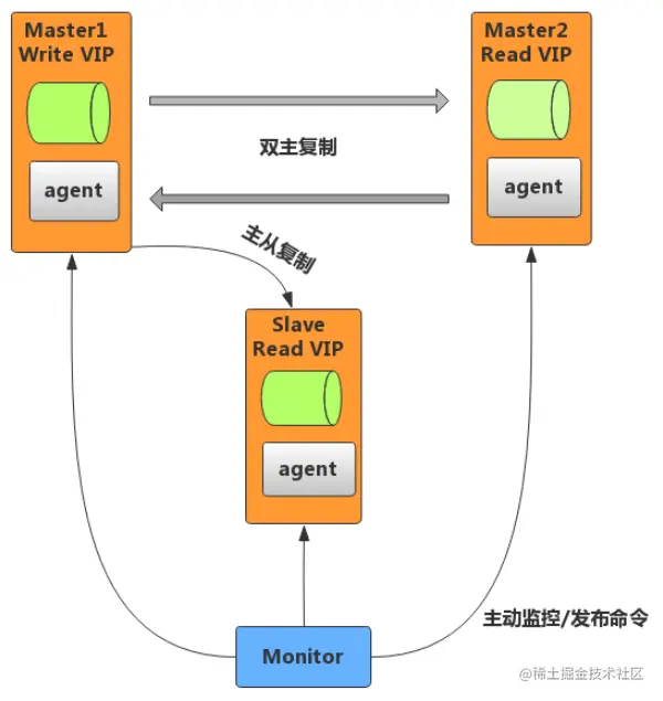 - agent:运行在每个 MySQL 服务器上的代理进程,monitor 命令的执行者,完成监控的探针工作和具体服务设置,例如设置 VIP(虚拟IP)、指向新同步节点。