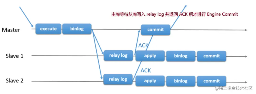 为了提升数据安全,MySQL让Master在某一个时间点等待 Slave节点的 ACK(Acknowledge character)消息,接收到ACK消息后才进行事务提交,这也是半同步复制的基础