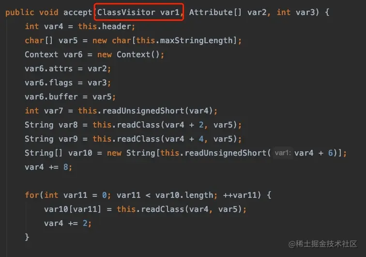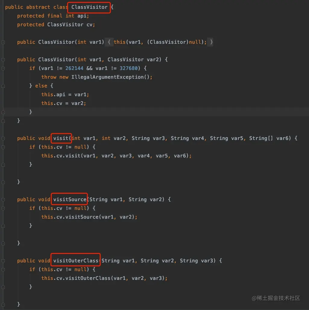 ClassVisitor 相当于抽象访问者接口。ClassReader 对象创建之后,需要调用 accept() 方法,传入一个 ClassVisitor 对象。在 ClassReader 的不同时期会调用 ClassVisitor 对象中不同的 visit() 方法,从而实现对字节码的修改。
