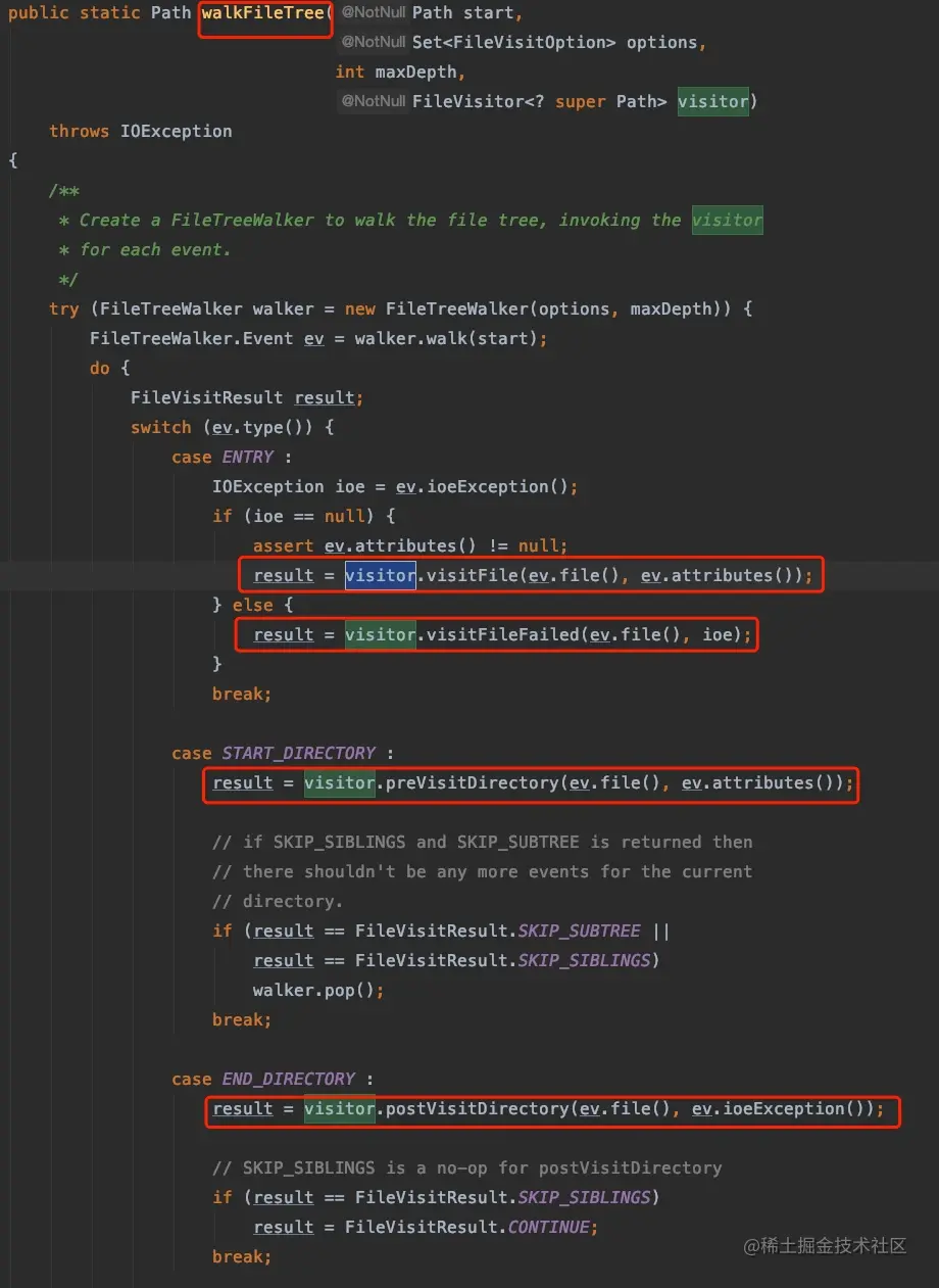 FileVisitor 中定义的 visitFile() 方法,其实就是对于文件的访问。被访问者(文件)的信息通过第一个参数 file 传递过来。这样遍历者就可以访问文件的内容了。