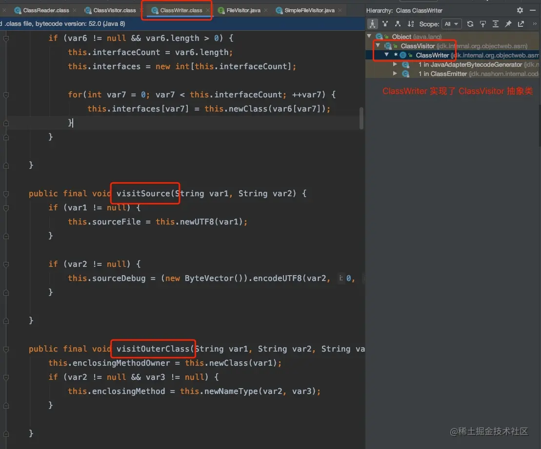 ClassWriter 是 ClassVisitor 的是实现类,它负责将修改后的字节码输出为字节数组。