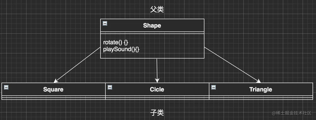 而对于新增的阿尔米巴原虫形状,我们只需要新建一个类,继承于 Shape 父类,只需要覆写父类的 rotate() 和 playSound 方法即可,无需改动另外三个类。