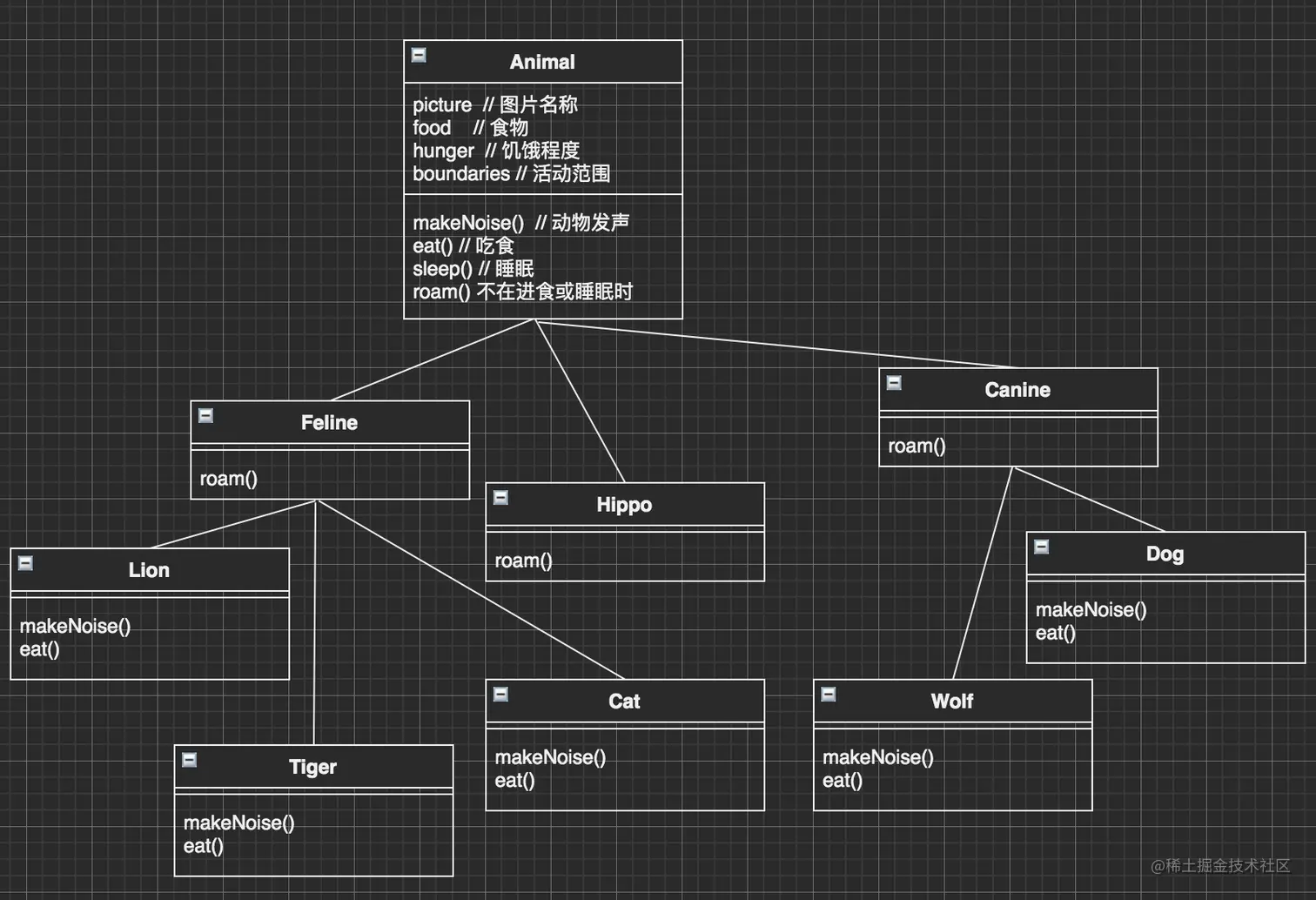 - 分析并找出具有共同属性和行为的对象(比如 picture 图片、food 食物、hunger 饥饿程度、boundaries 活动边界、makeNoise 发出的声音、eat 吃饭、roam 散步)。