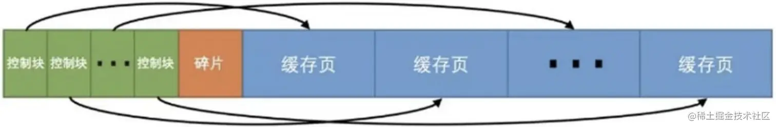 InnoDB为每一个缓存页都创建了一些控制信息,这些控制信息包括该页所属的表空间编号、页号、页在Buffer Pool中的地址、LSN等信息,每个缓存页对应的控制信息占用的内存大小是相同的,我们就把每个页对应的控制信息占用的一块内存称为一个控制块吧,控制块和缓存页是一一对应的,它们都被存放到 Buffer Pool 中,其中控制块被存放到 Buffer Pool 的前边,缓存页被存放到 Buffer Pool 后边,所以整个Buffer Pool对应的内存空间看起来就是这样的: