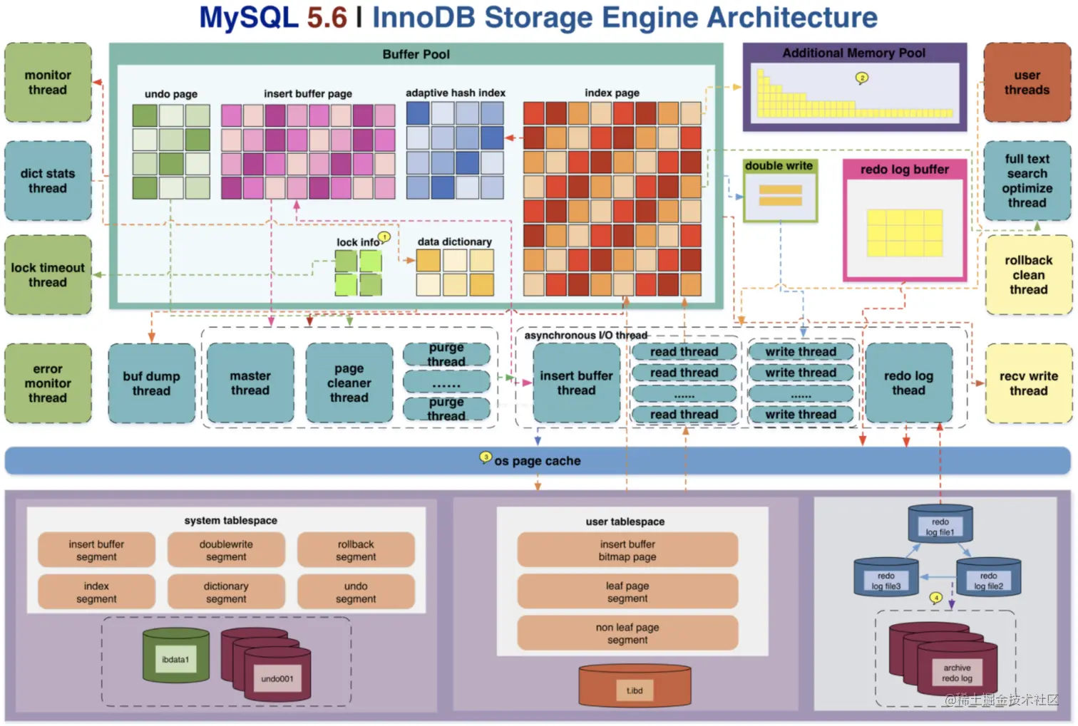 后台线程:负责刷新内存池中的数据,保证缓存池中的内存缓存是最近的数据,将已修改的数据刷新到磁盘文件,同时保证数据库发生异常的情况能恢复到正常情况;