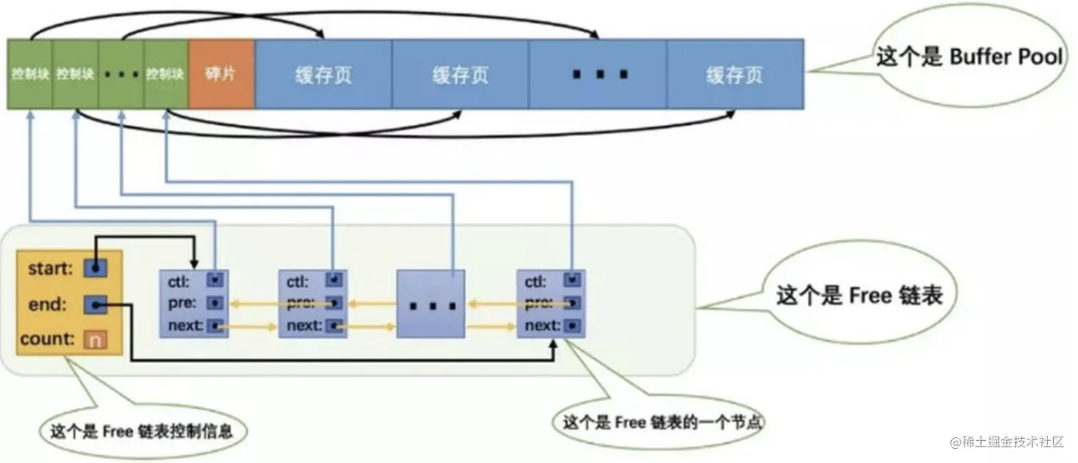当我们最初启动MySQL服务器的时候,需要完成对Buffer Pool的初始化过程,就是分配Buffer Pool的内存空间,把它划分成若干对控制块和缓存页。但是此时并没有真实的磁盘页被缓存到Buffer Pool中,之后随着程序的运行,会不断的有磁盘上的页被缓存到Buffer Pool中,接下来会有一个问题就是怎么区分Buffer Pool中哪些缓存页是空闲的,哪些已经被使用?我们最好在某个地方记录一下哪些页是可用的,我们可以把所有空闲的页包装成一个节点组成一个链表,这个链表也可以被称作Free链表。因为刚刚完成初始化的Buffer Pool中所有的缓存页都是空闲的,所以每一个缓存页都会被加入到Free链表中,整体设计如下图: