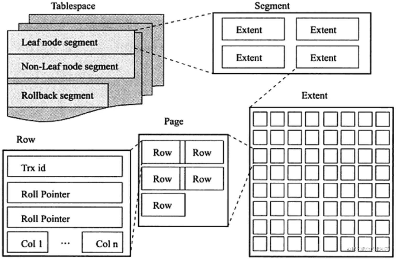 表空间主要分为两类文件,一类是共享表空间,一类是每张表单独的表空间,单独的表空间存放的是表中的数据、索引等信息,共享的表空间主要是存储事务信息、回滚信息等数据;表空间由段(Segment)、区(Extend)、页(Page)、行(Row)组成,接下来简单介绍一下这4种结构: