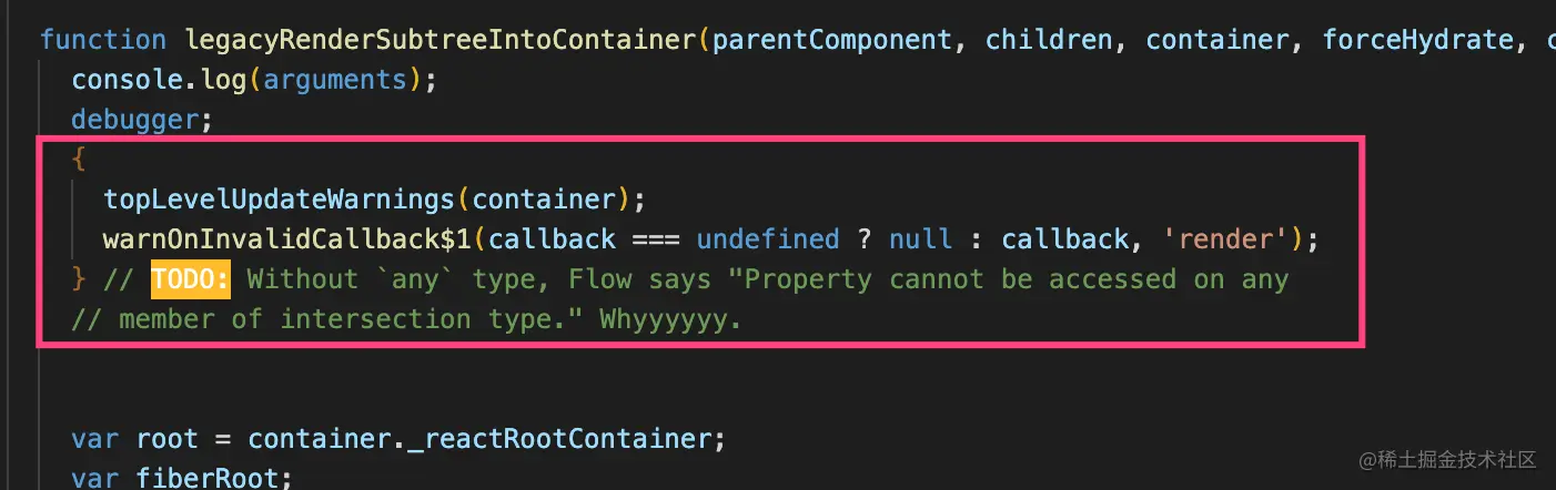 ReactDOM.render方法中,本身没有太多逻辑,只是最后return的是legacyRenderSubtreeIntoContainer(null, element, container, false, callback);;因此我在legacyRenderSubtreeIntoContainer函数中debug;
