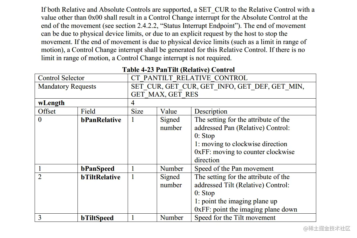UVC_CT_PANTILT_ABSOLUTE_CONTROL和UVC_CT_PANTILT_RELATIVE_CONTROL控制,看看在协议文档中的定义: