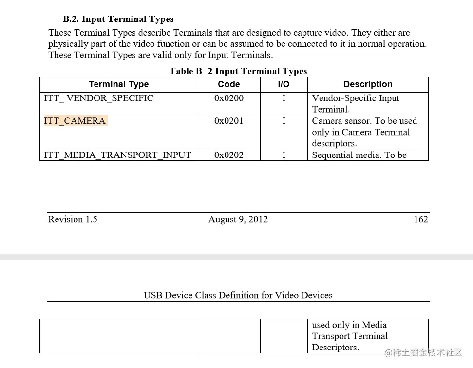 用于区分终端类型,重点关注UVC_ITT_CAMERA类型,看看这个类型在UVC协议文档里面的定义: